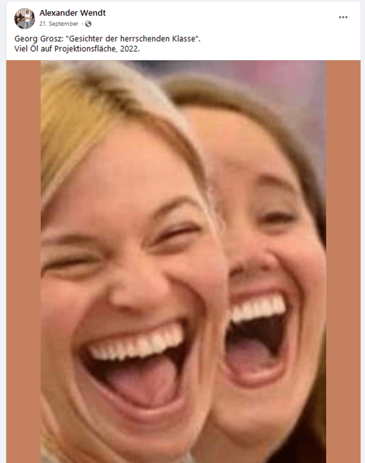 Beispielhaft soll hier die „Rezeption“ des m. E. klar dem rechtslibertären Spektrum zu zuordnendem Journalisten und Publizisten Alexander Wendt eines Selfies der herzlich lachenden Ricarda Lang (Grüne Bundesvorsitzende) und der nicht minder fröhlichen Katharina „Katha“ Schulze (Fraktionsvorsitzende im bayr. Landtag) herangezogen werden. Herr Wendt stellt diesen Schnappschuss[1] so dar, als sei dieser das Gemälde des mir vorher gänzlich unbekannten sozialkritischen Karikaturisten Georg Grosz (Hauptschaffenszeit wohl in der Weimarer Republik) und trage den Titel „Gesichter der herrschenden Klasse“.